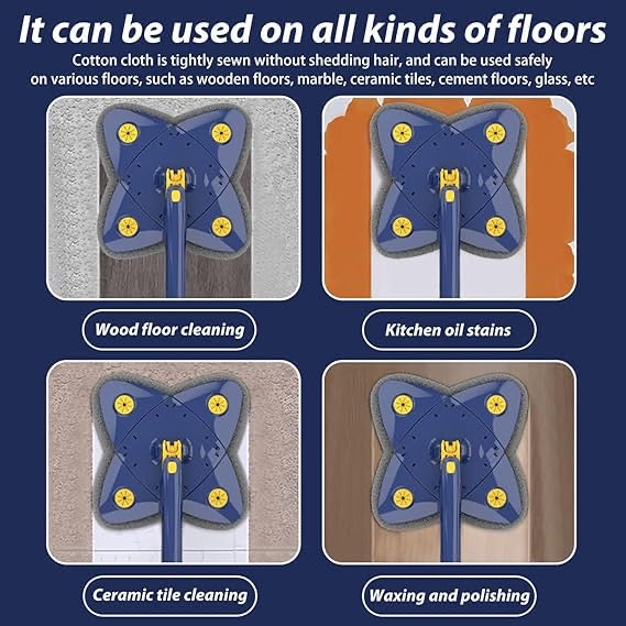 Simply push and pull gently to remove excess water and get back to cleaning High Quality Microfiber material : Experience the ultimate cleaning convenience with our 360° rotating mop. It boasts a thickened and encrypted microfiber mop cloth that's not only durable but also absorbs water in a flash within just 5 seconds! Its superior adsorption capacity ensures that dust is trapped tightly, leaving your floors and windows sparkling clean in no time. Versatile Design: The cleaning mop has a 360° rotating dust mop head that makes it easy to clean hard-to-reach areas, including wall and ceiling corners, windows, and under furniture. Its efficient design also allows it to be used for various cleaning tasks, such as removing dust, hair, dirt, grease, and even cleaning kitchens and shoes. Easy to clean & Install :