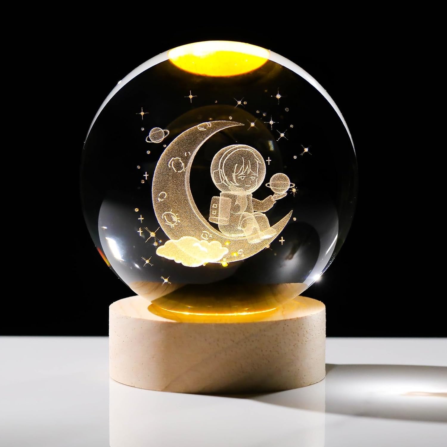 3D Astronaut Crystal Ball Night Lamp, Creative Engraved Crystal Ball Night Light, USB Table LED Wooden Crystal Ball for Home Decoration Birthday Gift for Teens, Boys, Girls