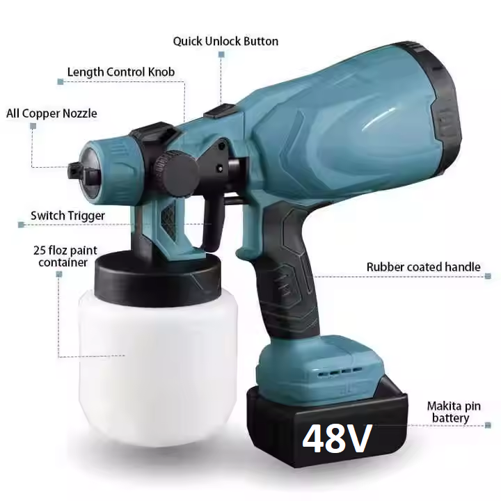 - Cordless Design : The electric spray gun adopts a cordless design, allowing you to get rid of the interference of wires and work freely. The 2 x 3000mA high-capacity battery can work continuously for a long time