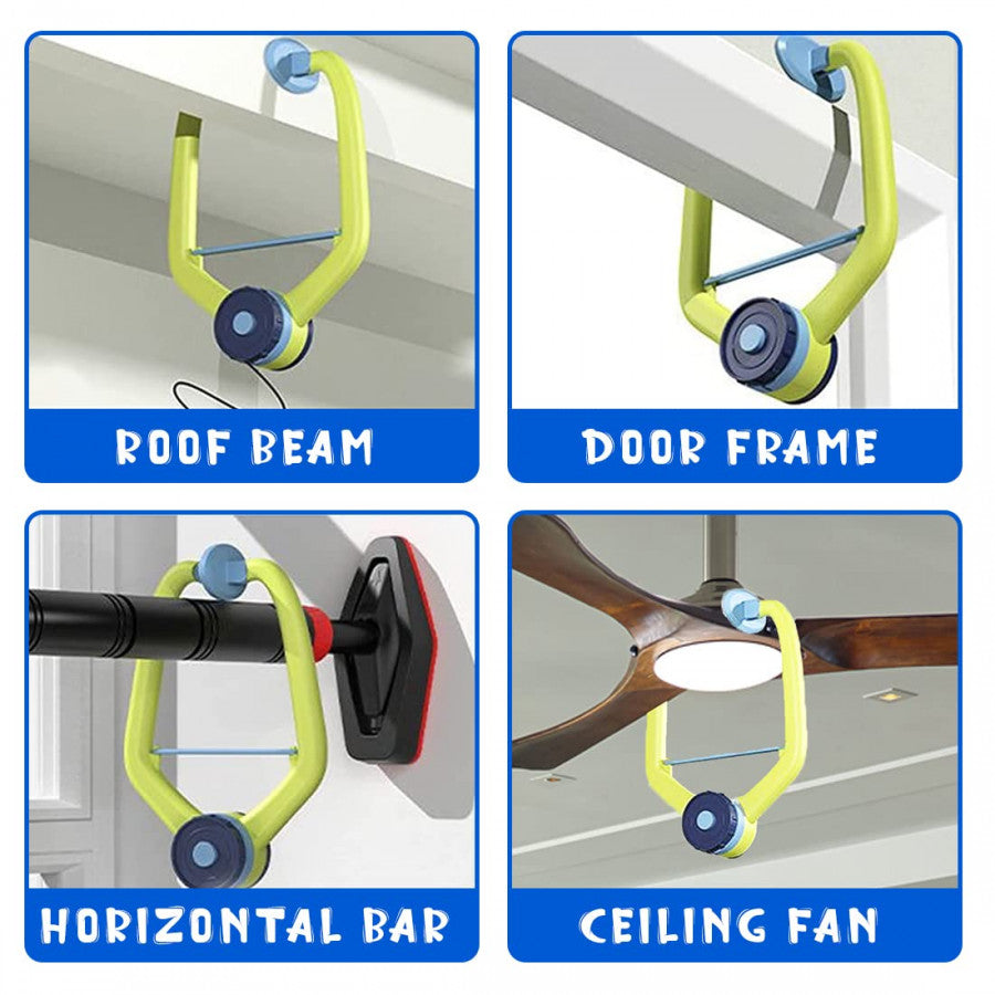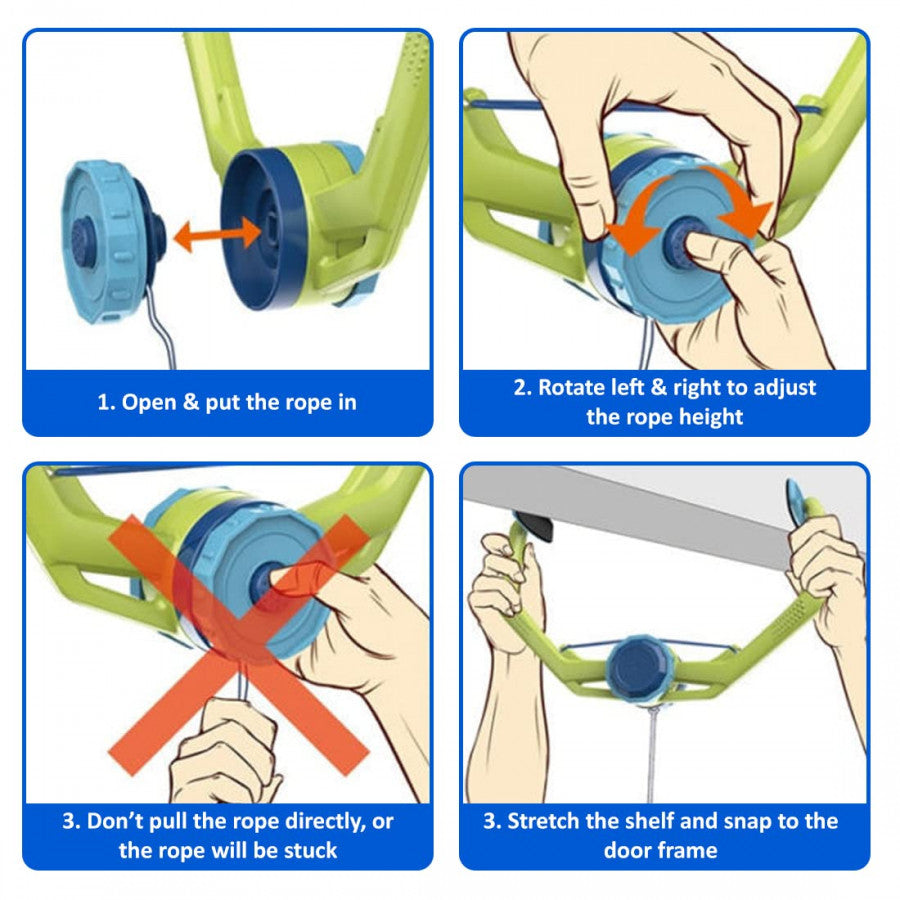 Just fix the clip to the top of a door or beam, adjust the rope length, and start playing. Takes less than 1 minute to set up.