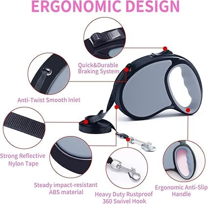 - Reflective& 360° Tangle-free - Durable dog leads is embedded with strong nylon materials. Highly reflective nylon leash increase security & visibility for dogs and their owners early in the morning or late at night. 360° Tangle-Free design make the retraction more easy and smoothly.